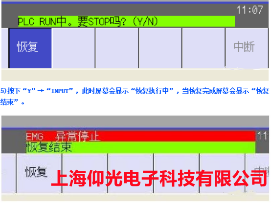 4.選擇完裝置后,按下“恢復(fù)”→“INPUT”→“Y”,此時屏幕顯示“PLC RUN。要 STOP 嗎?(Y/N)”